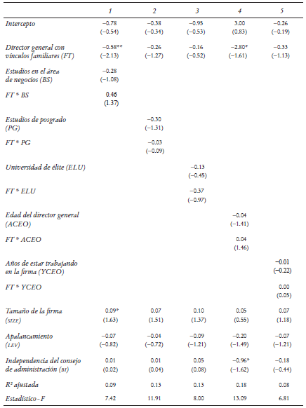 En el Cuadro 2 el coeficiente para FT (∂1) representa la relación lineal hipotética entre el rendimiento financiero y un director general con vínculos familiares, contando con la aparición de otras variables explicativas en la regresión. La primera hipótesis de estudio (H1), a saber que, bajo las condiciones de debilidad de las instituciones formales, la presencia de un director general con vínculos familiares se halla relacionada negativamente con el beneficio monetario de la compañía, queda confirmada (a 10% de significancia) tanto para el valor en libros (ROE) como para el valor de mercado (relación Q de Tobin), independientemente de la definición de negocio familiar que se emplee. Éste es un resultado esperado para un entorno de esa naturaleza, en el que reina el nepotismo y es más probable que los directores generales provenientes de la familia expropien los intereses de otras partes interesadas, mediante acciones que acarrearán un beneficio a la familia pero que habrán de perjudicar el rendimiento de la firma (Sitthipongpanich y Polsiri, 2015; Bertrand, Johnson, Samphantharak y Schoar, 2008; Cuervo-Cazurra y Dau, 2009). La ausencia de protección legal brindada a los accionistas minoritarios y a otras partes interesadas, junto con la falta de información relativa a los negocios y el insuficiente monitoreo de firmas por el mercado dan a los directores generales con vínculos familiares más incentivos y facilidades para perseguir sus propios intereses (Chang, 2003; Young, Peng, Ahlstrom, Bruton y Jiang, 2008).