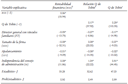 Esta sección aborda el tema de la causalidad inversa en lo que respecta al beneficio económico o la rentabilidad y la administración a cargo de un miembro de la familia. Un director general proveniente de la familia en teoría podría ser designado con la finalidad de revertir el bajo rendimiento de una firma, de modo que esa persona vendría a constituir el efecto (y no la causa) de los desoladores resultados que obtuvo la compañía. En el Cuadro 7 se muestran los resultados derivados de correr regresiones utilizando el método generalizado de momentos (MGM). Se emplea la transformación de desviaciones ortogonales con el propósito de hacer a un lado los efectos fijos transversales. A continuación, se obtienen los instrumentos del sistema conocido como el método generalizado de momentos (MGM) mediante la metodología Arellano-Bover. Se recurre a ponderaciones robustas con el estimador White del periodo (en dos pasos) para calcular los errores estándar.