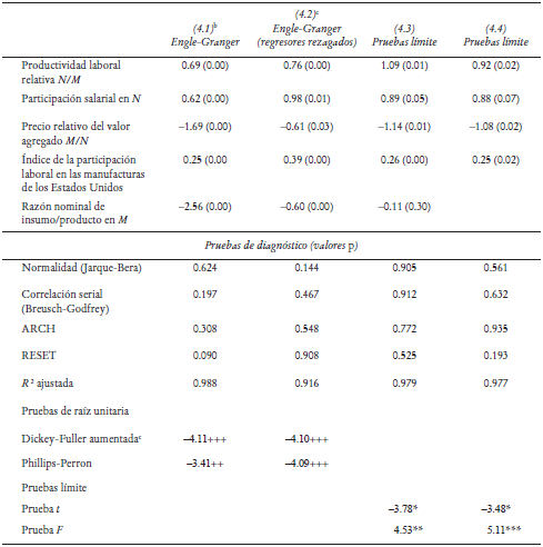 En el Cuadro 4 se presentan ecuaciones ampliadas para la participación salarial que incluyen la razón insumo-producto y la participación laboral en las manufacturas estadunidenses. Las dos primeras columnas presentan las regresiones Engle-Granger. En ambos casos, las pruebas de raíz unitaria siguen apoyando la existencia de una relación de largo plazo. Además, los resultados previos concernientes al signo y la significancia estadística de los coeficientes de la productividad relativa del trabajo, el precio relativo de las manufacturas y la participación salarial en los bienes no comerciables se mantienen. Respecto de las nuevas variables, la participación salarial en las manufacturas de México aparece correlacionada positivamente con la participación laboral en los Estados Unidos, como se esperaba, y negativamente con la razón insumo-producto nominal. Nuevamente, usar los valores rezagados de las variables explicativas no cambia cualitativamente los resultados, pero cuantitativamente hay un incremento en el tamaño del coeficiente estimado de la participación salarial en los no comerciables y un decremento en los coeficientes del precio relativo de las manufacturas y la razón insumo-producto.