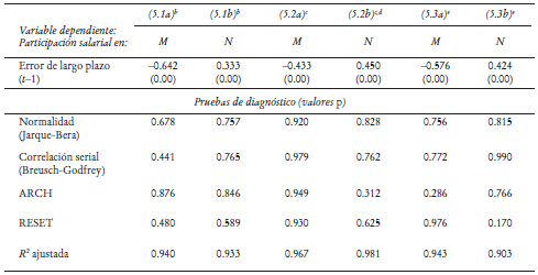 Finalmente, en el Cuadro 5 se presentan estimaciones para los MCE. Los modelos usan el error de largo plazo derivado de las ecuaciones (3.1), (3.2) y (4.4) en los Cuadros 3 y 4. Por razones de espacio, el cuadro sólo presenta el coeficiente estimado de corrección de error (junto con los resultados de las pruebas de diagnóstico) correspondiente a las dos versiones de cada MCE: una en que la variable dependiente es el cambio en la participación salarial en las manufacturas y otra en que la variable dependiente es el cambio en la participación salarial en los bienes no comerciables. En todos los casos el coeficiente de corrección de error estimado en las ecuaciones para el cambio en la participación salarial en las manufacturas es altamente significativo en términos estadísticos, grande en términos absolutos y muestra el signo negativo esperado con un valor cuyo rango va de -0.43 a -0.64. Esto significa que el nivel de la participación salarial en las manufacturas reacciona en la dirección esperada ante desviaciones rezagadas de su valor de largo plazo: por ejemplo, la participación salarial disminuye cuando -controlando por el nivel de la productividad relativa, los precios relativos y la participación laboral en los Estados Unidos- su nivel es muy alto en relación con la participación salarial en los bienes no comerciables. A la vez, el coeficiente de corrección de error en las ecuaciones estimadas para el cambio en la participación salarial en los no comerciables es altamente significativo, grande y con un valor positivo cuyo rango va de 0.33 a 0.45. Esto muestra que la participación salarial en los no comerciables también reacciona ante desviaciones respecto de la relación estimada a largo plazo: cuando la participación salarial en las manufacturas es muy baja, por ejemplo, la participación salarial en los no comerciables disminuirá. Así, de acuerdo con la evidencia de los MCE, la participación salarial tanto en las manufacturas como en los bienes no comerciables reacciona en la dirección esperada a las desviaciones rezagadas de su relación de largo plazo.