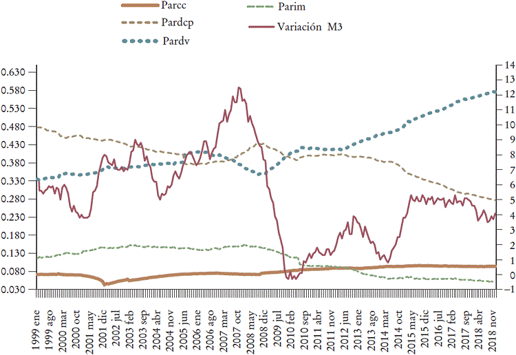 Adicionalmente, durante el periodo analizado (1999-2018) se han producido cambios institucionales inherentes al proceso de creación y consolidación de una política monetaria común y a la ampliación de la zona euro.1 Junto a este escenario de continuo cambio, la innovación financiera en medios de pago ha acentuado su progresión. A su vez, la innovación en productos, la desregulación y la globalización pudieron afectar el comportamiento de los agentes sobre la distribución de su riqueza financiera. En este contexto, la incertidumbre sobre la situación de solvencia de algunas instituciones financieras, unida a los acontecimientos anteriores, puede estar detrás del extraordinario crecimiento de los componentes más líquidos del M3 (dinero en circulación y depósitos a la vista). Por último, las dudas sobre la capacidad de hacer frente a los compromisos de deuda por parte de algunos Estados e incluso sobre la propia moneda, en los momentos más duros de la crisis (2011-2013), están en el origen de fuertes recomposiciones de cartera.