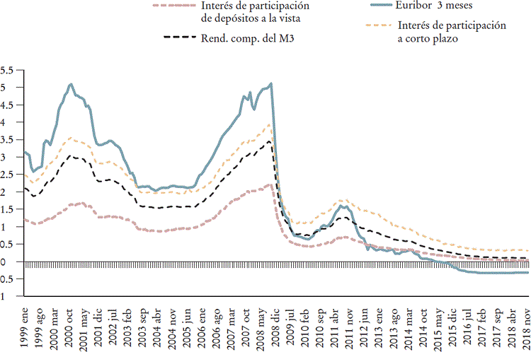 A partir de finales de 2008, con la crisis financiera y económica se produjo un derrumbe de las tasas de interés, así como de la inflación, con un ligero ascenso en 2011 y el primer trimestre de 2012, para alcanzar mínimos históricos sucesivos desde el último trimestre de 2011 hasta diciembre de 2018. Respecto del M3, este agregado redujo su tasa de crecimiento de forma ininterrumpida desde 12% en octubre de 2007 hasta -0.3% en febrero de 2010. Su comportamiento ha sido errático, habiendo alcanzado un nuevo mínimo a mediados de 2014, en torno a 2%. En la mitad de 2015 la tasa de crecimiento del M3 se situó en torno a 5%, manteniendo dicha tasa durante dos años. A finales de 2017, suavizó su tasa de crecimiento, para situarse durante 2018 en una tasa de 4%. El crecimiento de 5% del M3 durante 2016 y 2017 representó la mayor tasa en los últimos nueve años.