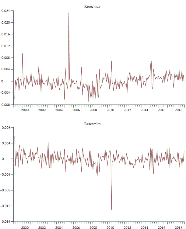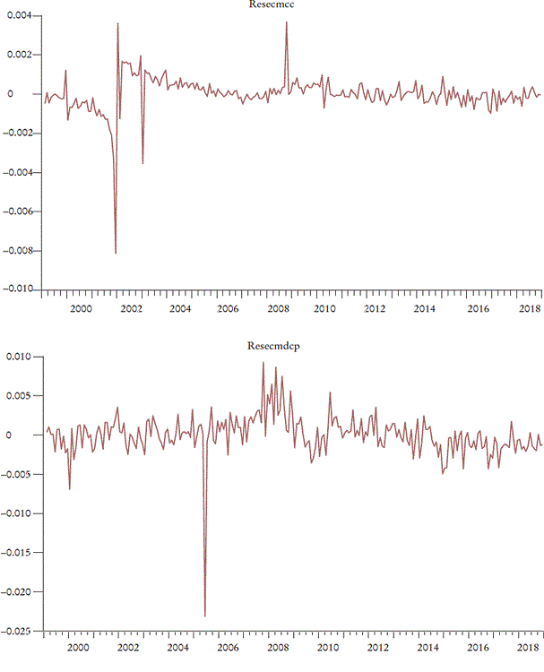 Estos resultados están en línea con los de Calza et al. (2000), quienes, con datos de 20 años antes de la unión monetaria, obtuvieron resultados del t-MCE que confirmaban la existencia de cointegración para las participaciones de los diferentes componentes del M3, excepto para el caso de los instrumentos de mercado. Con los datos del periodo analizado por nosotros, 1999-2018, sin embargo, encontramos también cointegración en la participación de estos instrumentos a través de los test de Johansen. Sin embargo, si bien el signo y la significación de en el MCE de la Ecuación (5) es el correcto, no es estadísticamente significativo.