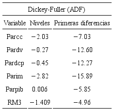 Como paso previo a la estimación de las ecuaciones de regresión para cada una de las participaciones de los componentes del M3, realizamos los test de raíces unitarias Dickey-Fuller (ADF) para todas las series de datos. El Cuadro 2 muestra los resultados de las pruebas ADF en niveles y en primeras diferencias de las cuatro participaciones del M3 anteriormente definidas, la tasa de interés compuesto utilizado RM3 que se calculó de acuerdo con la Ecuación (1) y la relación PIB/M3. Todos los test se realizaron considerando constante y tendencia. Como se puede observar, en el periodo de enero de 1999 a diciembre de 2018 todas las series son no estacionarias en niveles (paseos aleatorios). En primeras diferencias son estacionarias. Todas las series son, pues, integradas de orden uno I(1).