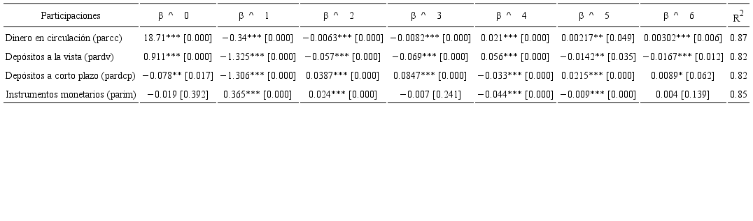 A continuación, se estiman las ecuaciones de regresión para la proporción de cada componente del M3 a través del método de MCO. El Cuadro 4 contiene los resultados de la regresión (4) para cada una de las proporciones de los cuatro componentes del M3.