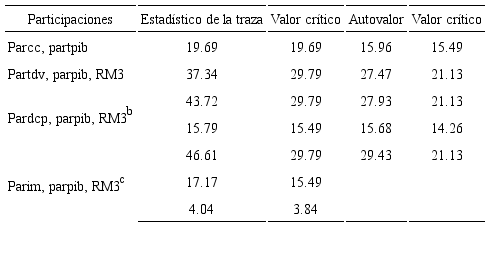 Como se observa, los resultados de la regresión de cada una de las participaciones del M3 sobre las variables macroeconómicas y las variables ficticias seleccionadas arrojan resultados muy atractivos, a juzgar por los valores p y por el coeficiente de determinación R2. No obstante, si la regresión se hace entre series de tiempo no estacionarias, como es el caso, las pruebas t y F no son válidas, debido a la posible presencia de regresión espuria. Por esta razón, se realiza un análisis de cointegración mediante la metodología de Johansen (1991). A la vista de los resultados que se muestran en el Cuadro 5, podemos afirmar que la ausencia de regresión espuria nos permite asegurar la validez de las pruebas t y F de la estimación de la regresión (4).