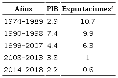 La política de apertura de Chile al mercado mundial ha dinamizado el comercio exterior21 y aumentado los flujos de inversión,22 lo que ha favorecido un crecimiento económico vigoroso, especialmente en el periodo 1990-1998, con una tasa media anual de 7.4%. Sin embargo, ese crecimiento se reduce a 4.4% en 1999-2007 y a 2.2% en 2014-2018 (FfrenchDavis, 2018 y 2019). Esa política también ayudó a la globalización del gran empresariado nacional que, de forma inédita, invierte masivamente en los mercados externos, principalmente en Sudamérica.23