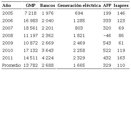 La GMC tuvo una extraordinaria rentabilidad sobre patrimonio en el periodo 20052011, que alcanzó 77% en promedio, cifra muy superior a 33% de las Isapres, 23% de las AFP y 22% de los bancos (Titelman, 2013). Esa rentabilidad generó utilidades extraordinarias, como destaca el Cuadro 2, que presenta Titelman, quien la compara con otros sectores económicos, también altamente rentables.