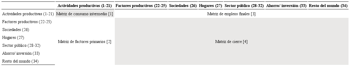 Matriz de cierre [4]: muestra las relaciones entre el valor agregado y la demanda final, las cuales permiten el cierre del flujo circular de la renta dentro de la estructura económica multisectorial; se trata de la parte que realmente completa el marco contable del análisis de una MIP (Cuadro 1).