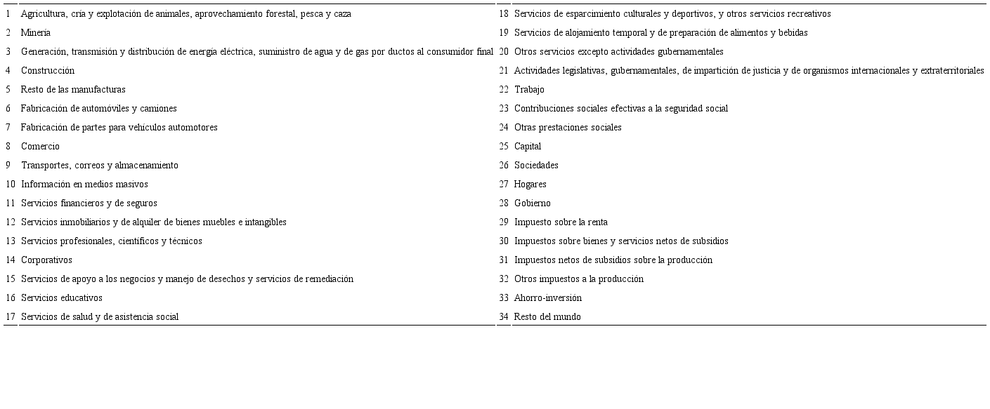 Después de las actividades (cuentas 1-21), la desagregación para obtener los flujos restantes entre la industria automotriz y el resto de la economía se realizó de la siguiente manera. Los pagos al factor trabajo (cuentas 22, 23, y 24) se obtuvieron a partir de las cuentas correspondientes a “sueldos y salarios que incluyen contribuciones sociales efectivas a la seguridad social” y “otras prestaciones sociales”. El gasto en capital (25) se obtuvo como el “excedente bruto de operaciones”. Los pagos al sector público (cuentas 28-32) corresponden a “impuestos sobre bienes y servicios netos de subsidios”, “impuestos netos de subsidios sobre la producción” y “otros impuestos a la producción”. Los ingresos en ahorro-inversión (33) se obtuvieron a partir de la suma de la “formación bruta de capital fijo” y la “variación de existencias”. Finalmente, la cuenta del resto del mundo (34) como gasto se obtuvo a partir del pago a las “importaciones totales” y como ingreso por la suma de las “exportaciones FOB” (free on board) y la “discrepancia estadística”.