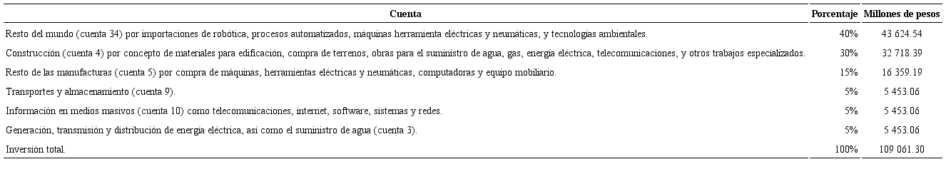Una vez descrito el origen de los flujos de capital, se plantea la distribución de la inversión conforme a los requerimientos de insumos por cuentas y actividades. Esto es de acuerdo con una consulta que se realizó a expertos en la industria de ensamblaje de vehículos respecto de la creación y/o ampliación de una planta de ensamblaje. El experto Juan Guillermo Escalante Flores plantea la distribución en la forma que se muestra en el Cuadro 4.5
