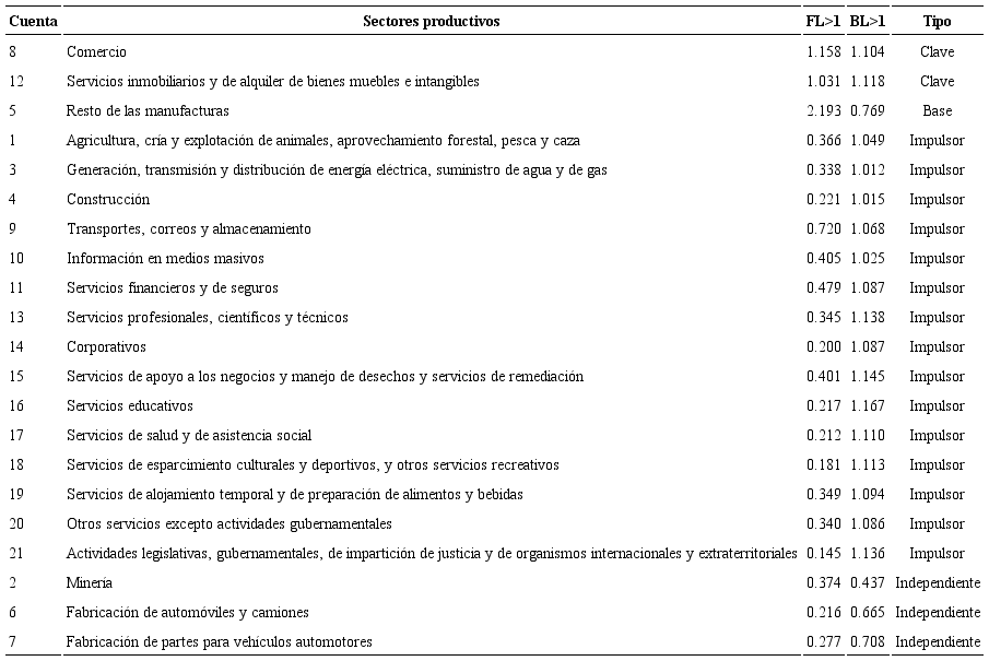 Sectores clave: son importantes demandantes de insumos intermedios para responder a un incremento de la producción mayor a la media. De igual forma, su producción es fuertemente demandada como insumos intermedios para el resto de las actividades con un valor mayor a la media. Son muy importantes para la economía, pues son fuertemente impulsados por variaciones en otros sectores. De igual manera, este impulso arrastra al resto de las actividades, por lo que genera un aumento general de la actividad económica.