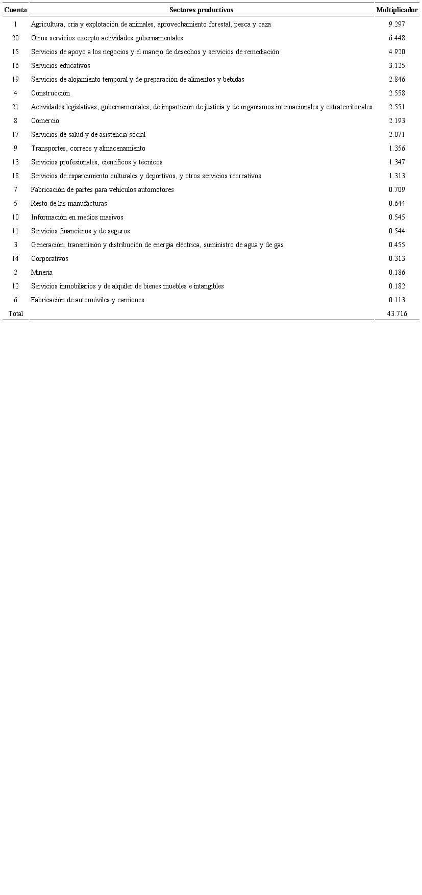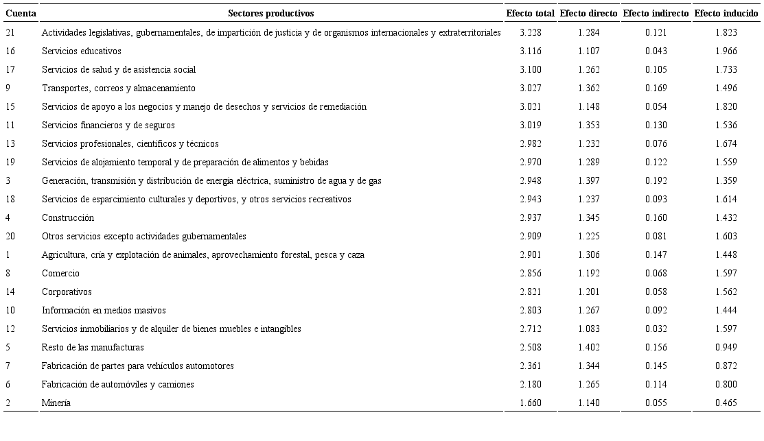 donde , es el número de trabajadores de cada actividad; Yi equivale a la producción total del sector i, y bij es el elemento ij de la matriz de multiplicadores obtenida a partir de la SAM. El valor numérico del efecto representa la cantidad de puestos de trabajo que se necesitan contratar en cada sector al aumentar la demanda en $1 000 000 (en el caso de México).