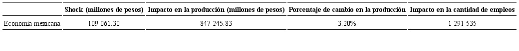 Una vez realizada la simulación, el efecto de este shock es de 847 245.83 millones de pesos sobre la producción total de la economía mexicana, así como un impacto de 1 291 535 empleos sobre el nivel de empleo total. Como referencia, el impacto generado por el shock es 3.20% sobre la producción total, una cifra muy cercana al equivalente que aporta esta industria al PIB, el cual fue de 3% (ProMéxico, 2016). El efecto sobre el empleo es menor, ya que en 2012 la industria generaba 573 000 empleos directos;6 de acuerdo con estimaciones realizadas por la Asociación Mexicana de Distribuidores Automotrices (AMDA) en su texto Diálogo con la industria automotriz 2012-2018 (2016), por cada empleo directo se generaban aproximadamente 1.9 empleos indirectos,7 por lo que el empleo total asciende a 1 661 000 empleos. En el Cuadro 8 se muestran los resultados relevantes obtenidos después del shock.