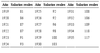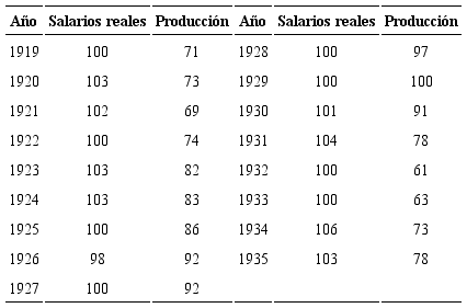 Las fluctuaciones en los salarios reales son pequeñas, y es fácil observar que no existe una correlación clara, positiva ni negativa, con las de la producción. Los salarios reales en la etapa de depresión más profunda (1932, 1933), por ejemplo, son iguales que los de la etapa de mayor prosperidad (1928, 1929).