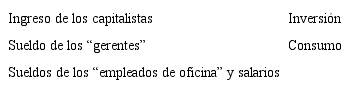 Puesto que en nuestro modelo el consumo de los empleados a sueldo y los trabajadores manuales es igual a su ingreso, al sustraer los sueldos y los salarios de ambos lados obtenemos: ingreso de los capitalistas = inversión + consumo de los capitalistas. Esta ecuación es muy importante para el argumento ulterior. De la misma se desprende que el ingreso de los capitalistas expresado en “valores estables” está determinado completamente por el volumen de su inversión y su consumo.