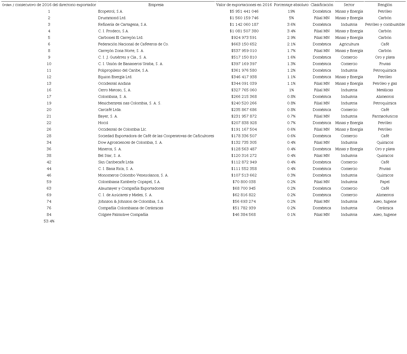 El Cuadro 1 presenta el listado de las empresas seleccionadas con información para 2016, según el puesto que ocuparon en el informe de la DIAN en ese año, mientras que el Cuadro 2 muestra un resumen por sectores y por peso de exportaciones.