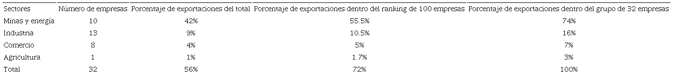 Como se desprende de la información del Cuadro 2, las empresas del sector de minas y energía concentran el mayor peso exportado en los apartados de petróleo, carbón, gas y extracción de oro; seguidas por las del sector industrial, donde sobresalen las exportaciones de algunas empresas derivadas de la actividad petrolera, como combustible y petroquímica. Igualmente, destacan las industrias: química, farmacéutica, papel, cerámica, alimentos, metálica, aseo e higiene. Por otro lado, en la agricultura sobresalen el café y las frutas como los principales productos exportados, mientras que en el sector de comercio destaca un grupo de empresas encargadas de la comercialización internacional de estos productos agrícolas, así como metales preciosos.