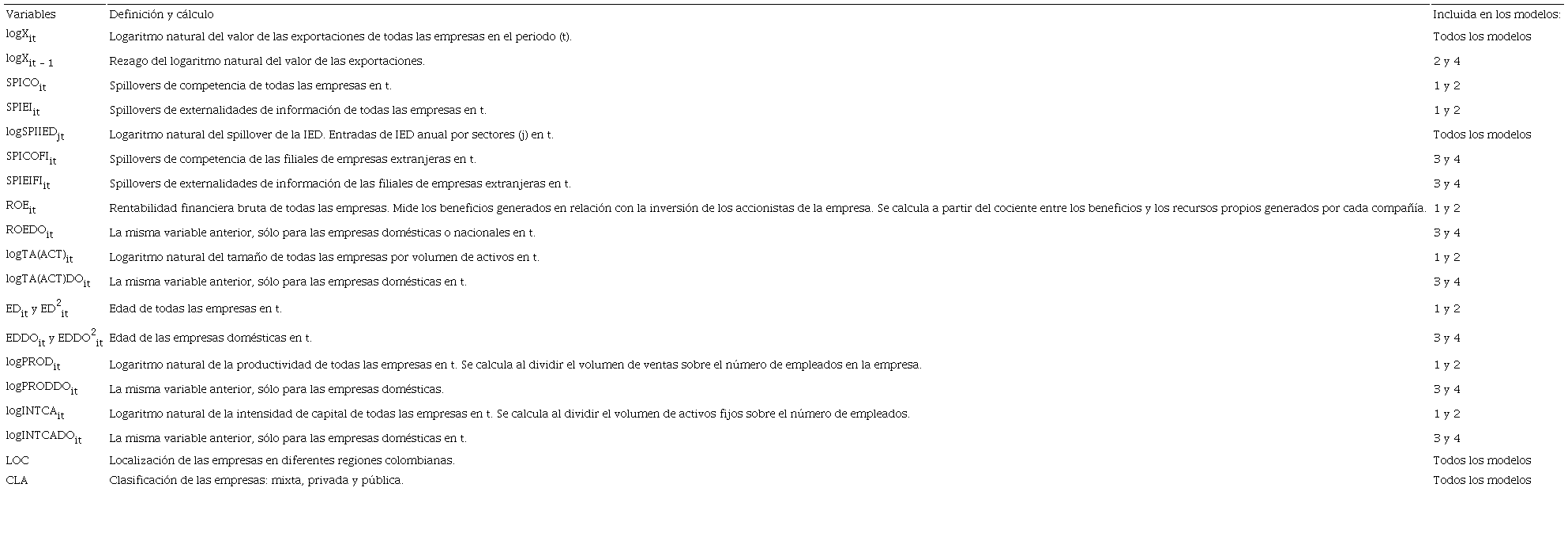 Con base en esta aproximación, las siguientes variables definidas como spillovers de exportación de la IED son tratadas como variables explicativas del modelo: 1) el efecto de competencia de las filiales de multinacionales sobre las empresas locales (SPICO); 2) el efecto asociado con las externalidades de información, el cual se deriva de la importancia relativa de las empresas multinacionales en las exportaciones de los sectores productivos locales (SPIEI), y 3) el efecto de presencia directa de la IED en los diferentes sectores productivos nacionales (SPIIED). Por otra parte, definimos Z como el vector de variables de control.