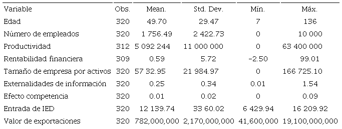 Con base en la literatura existente, se incluye un conjunto de variables a escala de empresa con el fin de capturar la heterogeneidad de las firmas como determinantes del volumen de exportación (Nguyen y Sun, 2012). En este caso, definimos este conjunto de variables que podrían afectar la capacidad exportadora de las empresas nacionales. En este trabajo usamos la metodología de De Clerq, Hessels y Van Steel (2008); incluimos variables como: tamaño de la empresa por volumen de activos, rentabilidad financiera bruta, edad de la empresa en cuanto al número de años de existencia, productividad e intensidad del capital. Del mismo modo, se toma en cuenta un par de variables dummy para definir: 1) el lugar de localización de las empresas, de acuerdo con las regiones donde están domiciliadas, y 2) la clasificación de las empresas en mixta, privada o pública.