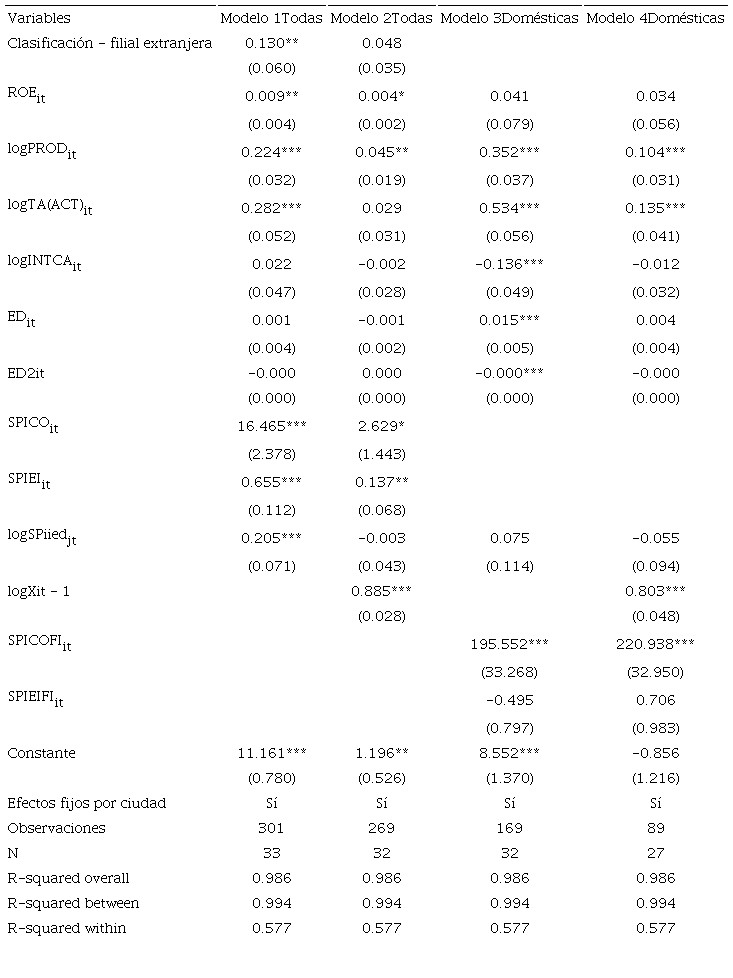 Específicamente, encontramos un coeficiente positivo y significativo en el spillover que mide el efecto competencia (SPICO) en los cuatro modelos, lo cual muestra la importancia relativa del empleo de las multinacionales sobre la oferta exportable colombiana. De manera especial, el coeficiente positivo y significativo de SPICOFI en los modelos 3 y 4 indica que las filiales de multinacionales en Colombia generan una presión competitiva sobre las empresas exportadoras domésticas que aumenta el valor de sus exportaciones. Este resultado, como hipótesis, sugiere que el aumento de la competencia por parte de las filiales extranjeras mediante la importancia relativa del empleo hace que las empresas exportadoras locales mejoren sus dotaciones productivas al ampliar su capacidad exportadora en aras de evitar la pérdida de sus mercados de exportación, ante la amenaza que representan las firmas extranjeras en los diferentes sectores productivos donde están instaladas. El resultado anterior coincide con los hallazgos de Sousa et al. (2000), Greenaway et al. (2004) y Ruane y Sutherland (2005) para las economías del Reino Unido e Irlanda.