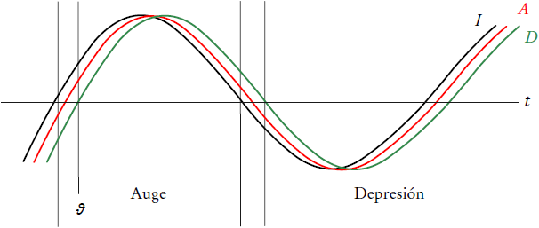 La Gráfica 1 permite entender la relación entre Y,1 el producto de la economía, y t, el tiempo. Esta relación se puede entender como el desfasamiento entre las curvas de I, A y D, las cuales determinan el crecimiento del producto, entendido como la suma de los ingresos de los trabajadores (W) y los de los capitalistas (R). En esta relación el tiempo ϑ es el diferencial en el que las expectativas de inversión se van reduciendo en fases de recesión o van aumentando en fases de auge.