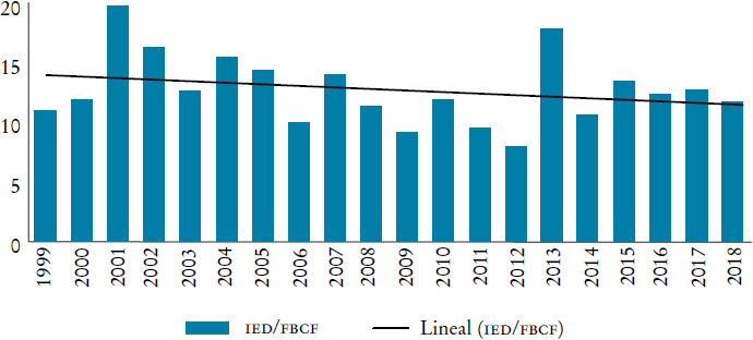 En los últimos 19 años, como se observa en la Gráfica 2, el coeficiente IED/ FBCF de 1999 a 2018 presentó una tendencia a la baja que se refleja en la reducción de 14% en 1999 a 11.7% en 2018. Esta pérdida ocurre a pesar de que México les ofreció a los capitales extranjeros, según datos de ProMéxico (2016), una reducción de costos de 12.3% en autopartes, 16.3% en componentes metálicos y 15.2% en insumos de plásticos. A su vez, según datos de la Oficina de Estadísticas Laborales de los Estados Unidos (Bureau of Labor Statistics, 2017), un trabajador en la industria automotriz ganó en los Estados Unidos un promedio de 3 372 dólares mensuales, que constituían 7.3 veces más que los 461.50 dólares mensuales que obtuvo un trabajador del mismo sector en México, lo que implica una reducción de costos laborales. No es por ello del todo evidente el impacto directo que la IED ha tenido en el crecimiento de la FBCF ni ha sido siempre igualmente significativo.