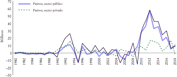 El trimestre de mayor afluencia de estos flujos fue el primero de 2012, cuando ingresaron 25 275 millones de dólares, resultado de una tendencia que venía ocurriendo desde el tercer trimestre de 2009. Entre 2007 y 2013 los flujos de cartera fueron mayores que los de IED, principalmente por la demanda de activos del sector público, que llegó a su máximo nivel en el segundo trimestre de 2012, cuando sus pasivos contabilizaron 19 752 millones de dólares.