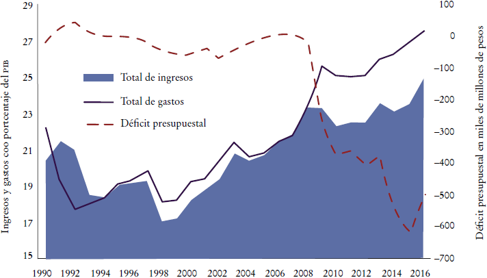 El control del déficit presupuestal desde la década de los noventa se sustentó en un programa de contracción del gasto en lugar de incremento de ingresos. La Secretaría de Hacienda y Crédito Público (SHCP, 2017) apunta que la recaudación equivale, en promedio anual durante el periodo 1990-2016, a 9.3% del PIB. En contraste, y a pesar de mantener el discurso de las finanzas sanas, el gasto público se incrementó aceleradamente desde 2009. El discurso de las finanzas sanas tiene un contenido falso, ya que, si bien se ha reducido el déficit fiscal en comparación con los años ochenta, en la última década tiene una tendencia que lo iguala a los niveles que impulsaron el cambio de paradigma económico.