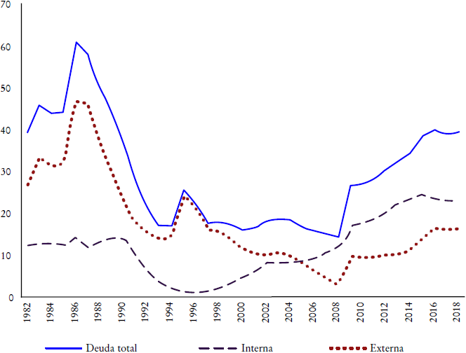 En la evolución de esta deuda -como se aprecia en la Gráfica 6- se distinguen tres momentos: 1) reducción del endeudamiento desde mediados de la década de los ochenta hasta mediados de la de los noventa; 2) desde entonces hasta 2008 se aprecia un periodo de bajo endeudamiento, con una reducción de la deuda externa, mientras que la interna creció; 3) tras la Gran Recesión de 2008 la tendencia cambió hacia un incremento acelerado del endeudamiento, que en 2016 equivalió a 41.5% del PIB, porcentaje no alcanzado desde 1988. Este nivel de endeudamiento hipoteca el futuro de las inversiones pública y privada.