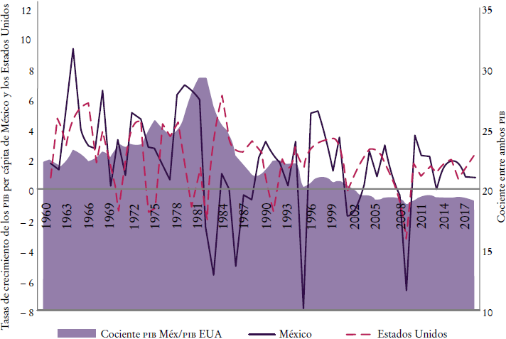 En el periodo de 1994 a 2018 -la era del TLCAN- el PIB per cápita de México creció a una tasa promedio ponderado anual de 0.93%, muy baja respecto de los socios de la OCDE y de la tasa que se tuvo en el periodo 1960-1980, cuando alcanzó un promedio anual de 3.85%. El producto por habitante canadiense creció en estos años a una tasa promedio ponderado anual de 1.89%, mientras que el de los Estados Unidos lo hizo a 2.01%. Esta comparación de resultados entre los miembros de este tratado proporciona saldos nada halagüeños para México.