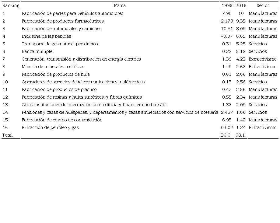 El Cuadro 3 muestra la evolución de las 16 principales ramas receptoras de IED y apunta a que en 2016 este subconjunto de ramas sumó 68.1% del total de la IED, porcentaje significativamente mayor que el de 1999, 36.6%; al igual, alcanzó un mayor grado de concentración, con 61.34% del total de la IED; se destacan el sector automotor, la fabricación de productos farmacéuticos y la industria de bebidas. La industria automotriz, la joya de la corona del TLCAN, alcanzó 18% del total de inversión en 2016, aunque la inversión en el sector de autos terminados se redujo, mientras que la de autopartes se incrementó. Más llama la atención que siete sectores (financiero, de bebidas, transporte de gas, generación de electricidad, minería, producción de hule y productos químicos) pasaran de recibir 5.61% en 1999 a 32% del total de la inversión en 2016.