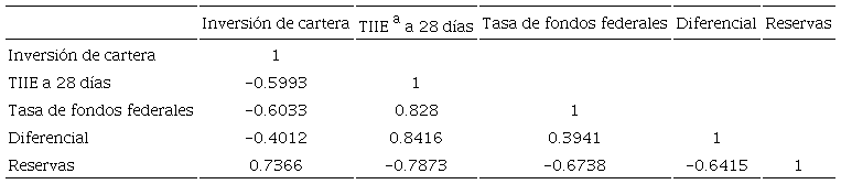 La matriz de correlación (Cuadro 4) ofrece evidencia sobre la estrecha relación entre las tasas de interés de los activos gubernamentales en los Estados Unidos y México, expresadas en el coeficiente de 0.82. Igualmente, lo hace en la correlación negativa que existe entre las tasas de interés, con el diferencial entre las tasas y los flujos de cartera a México, lo que hace evidente el bajo nivel de autonomía de la política monetaria del banco central mexicano. Por su parte, el coeficiente de 0.73, que correlaciona los flujos de inversión de cartera y las reservas internacionales, expresa una alta relación entre el crecimiento de las reservas y los flujos de cartera, lo que apunta a que el incremento de estos flujos ocurre por la certidumbre que da a los capitales especulativos la acumulación de reservas internacionales.