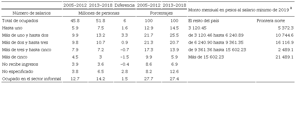 Simultáneamente, la población ocupada que obtiene entre tres y cinco salarios mínimos se redujo de 17.3 a 13.9%. También la población que obtiene más de cinco salarios mínimos se redujo, al pasar de 9.9 a 5.9%, lo que implica que 1.5 millones de personas ya no obtienen ese nivel de ingresos. El dato crucial para la economía mexicana es que sólo 5.9% de los ocupados devenga ingresos superiores a cinco salarios mínimos, lo que implica que más de 80.5% de la población ocupada obtiene por su trabajo menos de 26 861.45 pesos mensuales si trabajan en la frontera norte, y en caso contrario, sus ingresos son menores a 15 602.33 pesos mensuales.