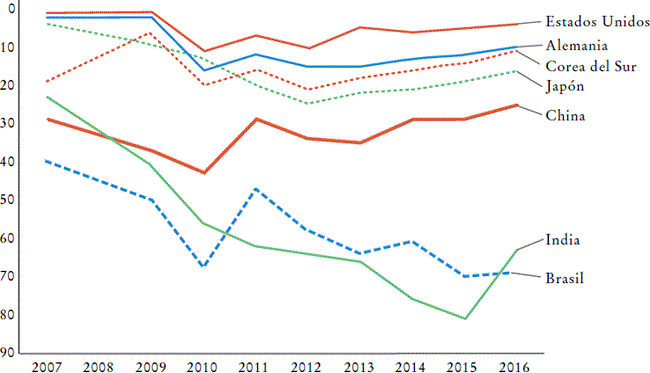 En gran medida, el rendimiento de la innovación refleja el esfuerzo realizado en las nuevas tecnologías. En un estudio reciente, Scott Kennedy (2017) presenta el conjunto de índices compuestos construidos para medir la innovación. Éstos tienen en cuenta el esfuerzo realizado en investigación y desarrollo como porcentaje del PIB, el número de estudiantes matriculados en la ciencia, el número de publicaciones científicas, las exportaciones de productos de alta tecnología, el número de patentes, e incluso la calidad de las instituciones, etc. Los subíndices obtenidos, su número y su ponderación difieren según los índices compuestos calculados. El Índice de Innovación Nacional elaborado por el Ministerio de Ciencia y Tecnología de China incluye 40 países, y China ocupa el puesto 18, ligeramente superior desde 2011. El índice compilado por Bloomberg se basa en 69 países; entre 2014 y 2016, la clasificación de China ha subido al 21º lugar. El índice compilado por el Foro Económico Mundial incluye 135 países; China ocupó el 29º lugar en 2009 y 2016, con una caída entre 2010 y 2015. El índice compuesto de la Universidad de Cornell, INSEAD, considera 128 países y se construye a partir de 103 índices; China ocupa el puesto 25 en 2016, con una puntuación particularmente alta en los subíndices de producción de tecnología y conocimiento (sexto lugar) y una puntuación baja en la calidad de las instituciones (79º lugar). Por último, puede observarse que en 2016 la puntuación más alta la obtienen los Estados Unidos, seguidos de Alemania y Corea del Sur, luego Japón, más lejos está China y mucho más atrás la India y Brasil.