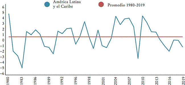 En América Latina la crisis vinculada con la pandemia se suma a otras crisis latentes o presentes, que acabamos de mencionar. No llega a un “cuerpo sano” listo para recuperarse una vez que la pandemia ha terminado. En efecto, 1) casi todos los países de la región y en particular los más grandes y poderosos-Argentina, Brasil, México- sufren una tendencia al estancamiento de la tasa de crecimiento de su PIB; 2) incluso antes de que las consecuencias económicas de la pandemia se hagan evidentes, Argentina y Venezuela están experimentando una profunda crisis económica unida a una inflación que se ha vuelto más o menos incontrolable, especialmente en Venezuela; Brasil, después de una crisis muy pronunciada equivalente a la de los años treinta, es incapaz de recuperarse; México, por último, entró en recesión a partir de 2019, y otros países están experimentando una ralentización de su actividad económica (Colombia, etc.); 3) por último, se ha observado un retorno a las restricciones externas en los últimos años con la caída de los precios de las materias primas y los volúmenes comerciados. La propagación mundial de la crisis actual y la fuerte caída de la demanda de los países asiáticos que son grandes importadores de estas materias primas están acentuando la presión ejercida por la restricción externa.