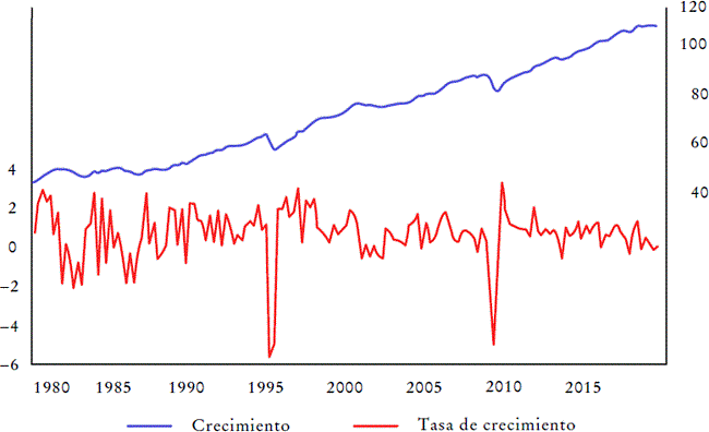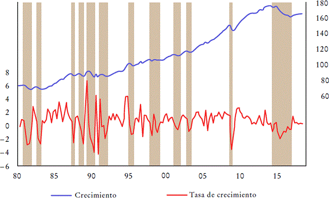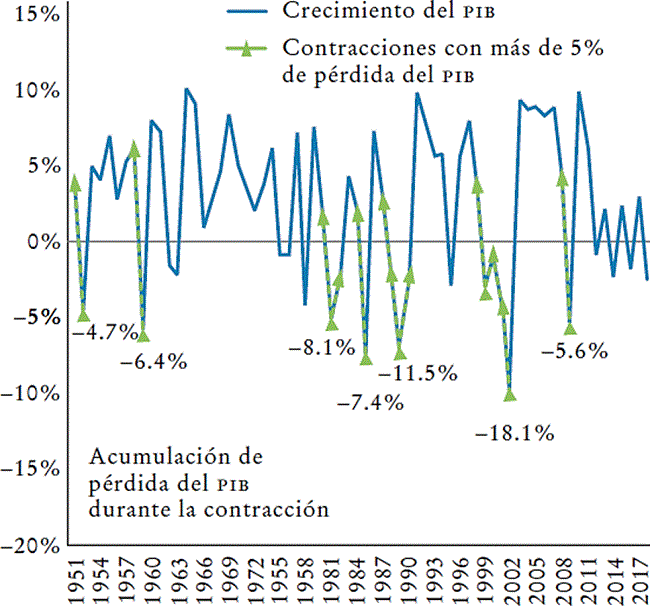 La volatilidad del PIB de México, aunque alta, es relativamente baja en comparación con la de Argentina. Sin embargo, la década de los ochenta (crisis de la deuda), los años 1993-1995 (efecto tequila, nombre dado a la crisis causada por un doble déficit muy grande en la balanza por cuenta corriente y el presupuesto) y 2009 (contagio internacional de la llamada crisis de las hipotecas de alto riesgo) se caracterizaron por unas tasas de crecimiento muy negativas.