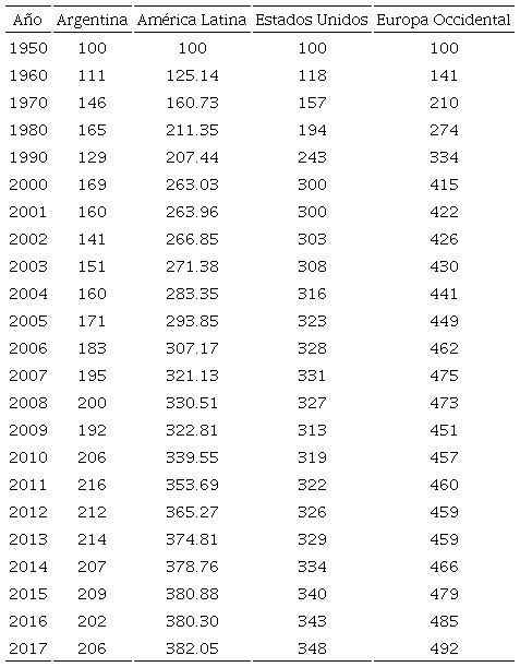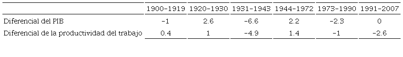 Las tasas medias de crecimiento per cápita durante un largo periodo en la mayoría de los países de América Latina se sitúan entre 0 y 2%. En particular, la tasa de crecimiento del PIB per cápita de México entre 1983 y 2017 fue de 0.8%. En los Estados Unidos, en el mismo periodo, fue de 1.7%, según datos del Banco Mundial. A diferencia de la doxa, si nos centramos en la tasa de crecimiento per cápita, México no es una economía emergente: su nivel de PIB no se acerca al de los países avanzados. Lo mismo ocurre con Argentina. Su marginación viene de lejos. En 1913 su ingreso per cápita equivalía a 65% del de Gran Bretaña. En 1945 era 60%, y en 2001 era 39%. La comparación con la renta per cápita de los españoles es aún más elocuente. En 1913 era casi cinco veces (393%) superior a la de éstos, y en 2001, año de la crisis, era apenas la mitad (51%). Si se trata de la diferencia tanto en el ingreso per cápita como en el crecimiento de la productividad, la comparación con los Estados Unidos es instructiva.
