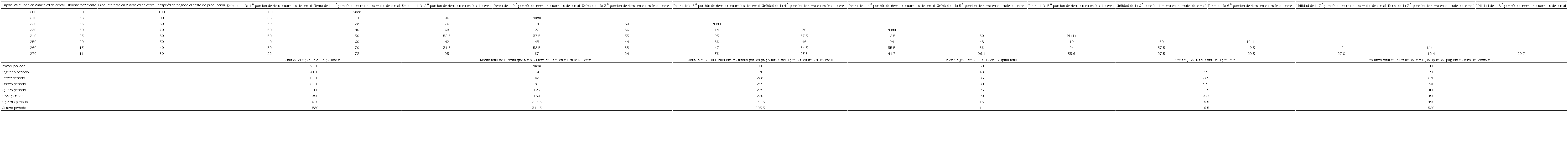 El Cuadro 1 está confeccionado sobre el supuesto de que la primera porción de tierra rinde una utilidad de 100 cuartales sobre un capital de 200; la segunda porción, 90 cuartales sobre 210, de acuerdo con los cálculos anteriores.5 Se verá que mientras un país progresa, aumenta el producto total obtenido de su tierra, y durante cierto tiempo aumentará la parte de la producción que corresponde a las utilidades del capital, así como la correspondiente a la renta, pero que en un periodo posterior toda acumulación de capital irá acompañada de una disminución tanto absoluta como proporcional de las utilidades, si bien las rentas aumentarán constantemente. Se verá que el propietario de capital gozará de un ingreso menor cuando se empleen en tierras de las distintas calidades 1 350 cuartales que cuando se utilizaban 1 100. En el primer caso las utilidades totales serán sólo de 270, en el segundo de 275, y cuando se empleen 1 610, las utilidades bajarán a 241 y media.6