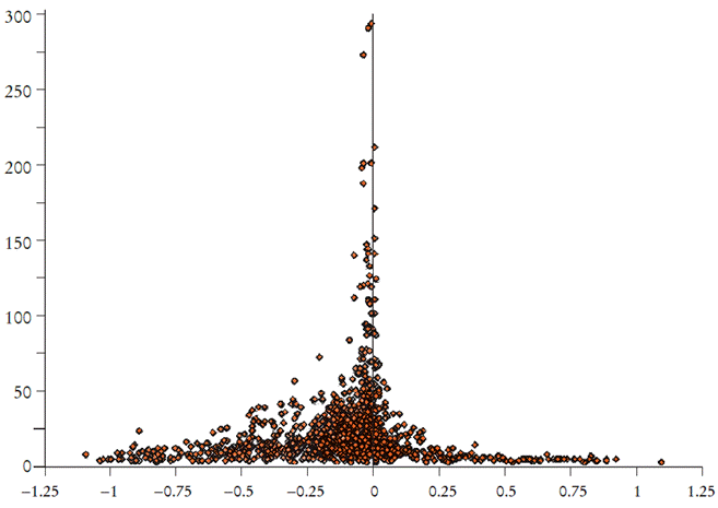 La Gráfica 1 se tomó del estudio de Wolfson y Belman (2019) y muestra una relativa simetría de las observaciones respecto del valor central. Por el contrario, en la Gráfica 2, presentada por Doucouliagos y Stanley (2009), aparece una asimetría hacia la izquierda, en favor de valores negativos de la elasticidad, pero con una precisión mediocre.
