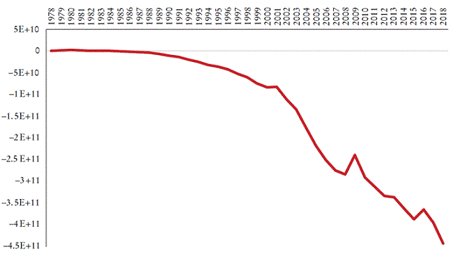 Con una selección de las bases estadísticas del Departamento de Comercio estadunidense, la evolución desde la década de los ochenta de la balanza comercial entre los Estados Unidos y China, expresada en dólares corrientes, se caracteriza por un deterioro muy marcado, casi permanente. Esta degradación sólo se desaceleró -temporalmente, antes de reanudar su curso- como resultado del impacto de las crisis que sacudieron la economía estadunidense en 2001 (estallido de la burbuja de la “nueva economía”) y en 2008 (crisis de subprimes, sistémica en realidad, que produjo sus efectos en China desde 2009 y sobre todo en 2012), o de las apreciaciones del yuan (2005 y 2011) y después de la crisis financiera del verano de 2015 en los mercados bursátiles chinos (Gráfica 1). Por lo tanto, este saldo, lentamente degradado en los años noventa, luego de manera más contundente en las décadas 2000 y 2010 cruzó la marca de 100 000 millones de dólares en 2002, la de 200 000 millones en 2005 luego la de 300 000 millones en 2011, antes de alcanzar, sólo para los bienes (excluyendo los servicios), el déficit récord de 419 500 millones de dólares en 2018 (Gráfica 2). China se convirtió entonces oficialmente en el mayor socio comercial de los Estados Unidos para los bienes intercambiados, con un total de 659 800 millones de dólares: 120 000 millones en exportaciones y 539 500 millones en importaciones. Mientras tanto, el comercio de servicios tuvo un superávit en favor de los Estados Unidos de 40 500 millones.
