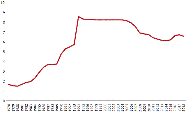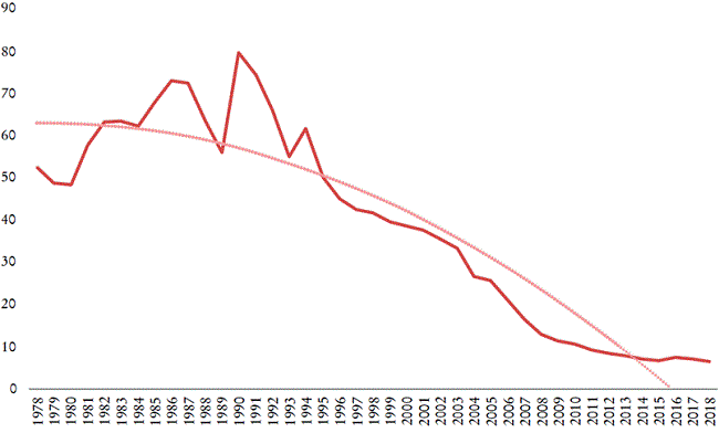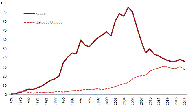 Nuestros resultados ilustran la existencia, en las últimas cuatro décadas, de un intercambio desigual entre los Estados Unidos y China que opera en favor de los primeros y a expensas del segundo. Las evoluciones en el contenido de trabajo integrado en los bienes y servicios comercializados (Gráfica 4) fueron diferentes en los dos países: aumentaron fuertemente hasta mediados de la década de los 2000, luego cayeron bruscamente, para estabilizarse a principios de la década de 2010 en China, pero de manera más moderada y continua con un aumento en los Estados Unidos; las dos curvas convergen al final del periodo. El alcance del intercambio desigual se revela cuando se calcula la ratio de los contenidos de trabajo de las exportaciones. Por lo tanto, encontramos que entre 1978 y 2018, en promedio, se intercambió una hora de trabajo en los Estados Unidos por casi 40 horas de trabajo chino. Sin embargo, desde mediados de la década de los noventa -años de reformas en China, principalmente en materia fiscal y presupuestaria-, observamos una disminución muy marcada en el intercambio desigual, sin que desaparezca por completo (Gráfica 5). De hecho, en 2018 todavía se intercambiaron 6.4 horas de trabajo chino por una hora de trabajo estadunidense. Si no tenemos en cuenta el saldo comercial (excedente del lado chino), durante los 40 años considerados, en promedio, el empleado chino tuvo que trabajar más de 121 horas para obtener una hora de trabajo de los Estados Unidos (Gráfica 6). ¿La erosión de esta ventaja de los Estados Unidos en el intercambio explicaría el comienzo de su guerra comercial?