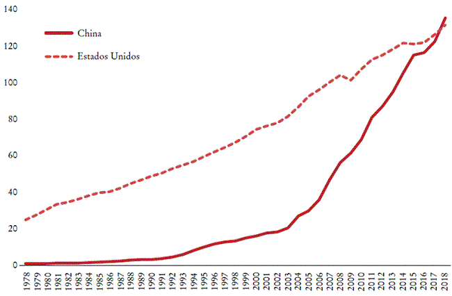 En ese contexto, muy paradójico, el lanzamiento en 2018 de la guerra comercial contra China podría interpretarse como un intento de la administración dirigida por el presidente Trump de frenar el lento y continuo deterioro de la ventaja de los Estados Unidos visto durante varias décadas en el comercio con su rival emergente. Pero ¿no es probable que el remedio sea peor que la enfermedad?