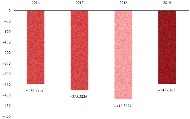 A continuación, sólo presentamos los resultados para el comercio bilateral China-Estados Unidos. Éstos confirman los que ya se recolectaron con el primer método (sección II) y destacan la existencia de una desigualdad en los intercambios entre 1995 y 2014. Los signos registrados -positivo para los Estados Unidos y negativo para China- corroboran la idea de que la transferencia de valor internacional ocurre de China a los Estados Unidos.