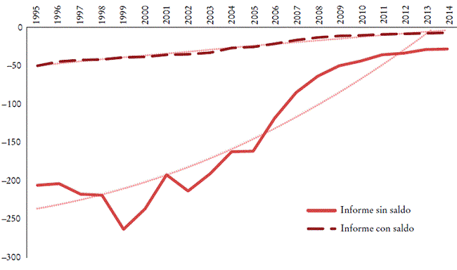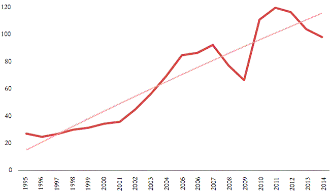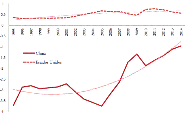 Esta redistribución, en beneficio de la hegemonía mundial estadunidense, es particularmente visible cuando el intercambio desigual se expresa en proporción a los valores agregados respectivos de los países (Gráfica 7). El monto de este último, indicado en términos monetarios en dólares corrientes, incluso tiende a aumentar entre 1995 y 2014, acercándose a 100 000 millones de dólares al final del periodo (Gráfica 8), o un poco menos de 0.5% del valor agregado estadunidense. No obstante, lo que sí vemos es que a los Estados Unidos les resulta cada vez más difícil mantener su ventaja y ganar en esta competencia comercial, y, por lo tanto, soportar las implicaciones del libre comercio, cuyas reglas en el pasado fueron en gran medida para su propio beneficio.