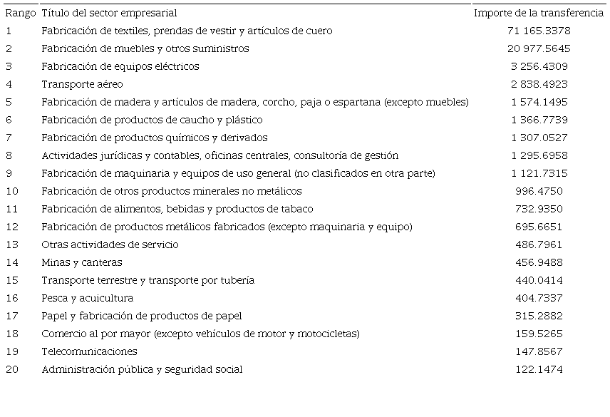 Sin embargo, es fundamental observar que estos resultados generales, resaltados conjuntamente por nuestros dos métodos distinguidos para calcular el intercambio desigual entre los Estados Unidos y China (secciones II y III), cubren, en cada economía, disparidades muy pronunciadas según los sectores de actividad que uno elija examinar. Los Cuadros 1 y 2 presentan, por lo tanto, para el último año de nuestra segunda muestra (2014), los montos de transferencias sectoriales cruzadas que se vincularon con los intercambios desiguales ocurridos en ambas direcciones durante el comercio sino-estadunidense. De los 55 sectores enumerados en la base de datos WIOD y cuyos movimientos de entradas-salidas no fueron cero en 2014, más de las tres cuartas partes (78.2% o 43 actividades) registraron una transferencia de valor desde China hacia los Estados Unidos. Las 20 transferencias más grandes, medidas en millones de dólares estadunidenses, se enumeran en el Cuadro 1. El sector textil, de ropa y de artículos de cuero lidera en gran medida, con 71 165 millones de dólares transferidos; seguido por el del sector de muebles y otros suministros, también muy alto, con 20 978 millones. Estas dos actividades representan casi 95% de las transferencias netas totales del intercambio desigual. Los otros sectores están muy por detrás, pero siete de ellos todavía revelan una transferencia de un monto superior a 1 000 millones de dólares: los equipos eléctricos (3 256); el transporte aéreo (2 838); la madera y los artículos de madera, corcho, paja o esparto, excepto los muebles (1 574); los artículos de caucho o plástico (1 366); los productos químicos y sus derivados (1 307); las actividades de consultoría legal, contable y de gestión (1 295), así como la maquinaria y los equipos de uso general misceláneo no clasificados en otra parte (1 121).