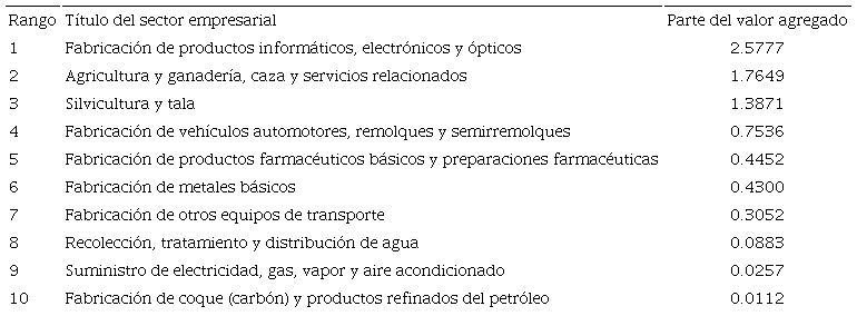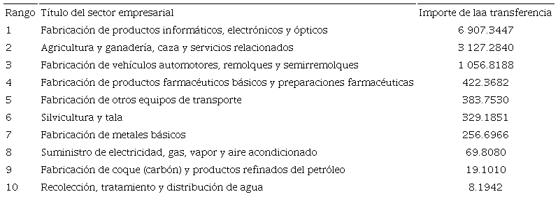 En el sentido contrario (Cuadro 2), 12 sectores están en el origen de una transferencia de valor que funcionó a expensas de los Estados Unidos en 2014, pero sólo cuatro tienen un monto superior a 400 millones de dólares: los de bienes de informática, electrónica y óptica (6 907 millones); agricultura y ganadería (3 127 millones); vehículos automotores, remolques y semirremolques (1 056 millones), y productos farmacéuticos básicos y preparaciones farmacéuticas (422 millones).