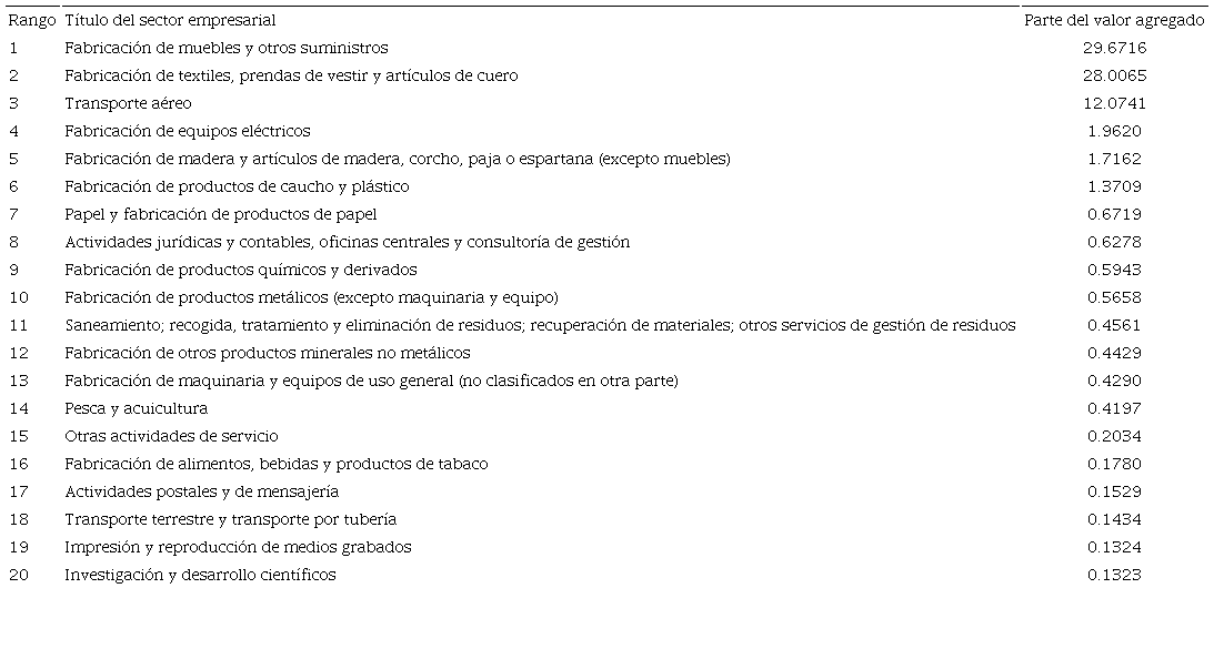 Como se ilustra en el Cuadro 3, cuando se comparan como una parte del valor agregado sectorial respectivo de los Estados Unidos o de China, las transferencias que reflejan estos intercambios desiguales entre los dos países parecen ser las más costosas para la economía china en los sectores de muebles y otros suministros (29.7%), y los textiles, prendas de vestir y artículos de cuero (28%). Acompañando a las industrias ya enumeradas en el cuadro 1 y agregados al transporte aéreo (12.1%), hay una gran cantidad de servicios, que van desde actividades legales, contables y de gestión (0.6%) hasta las de saneamiento (0.5%), pasando por los de correo y mensajería (0.2%) o de impresión y reproducción de medios grabados (0.1%); también se caracterizan por tales transferencias de valor que se benefician en los Estados Unidos. Aquellos sectores que, por el contrario, benefician a China (Cuadro 4) se refieren sólo a un rango mucho más estrecho de actividades económicas y alcanzan proporciones más pequeñas en el valor agregado estadunidense, aunque se nota que hay transferencias significativas para la fabricación de productos informáticos, electrónicos y ópticos (2.6%), la agricultura y ganadería (1.8%) y la silvicultura (1.4 por ciento).