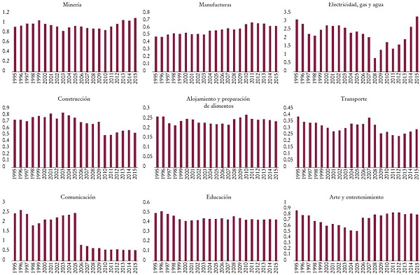 Cuando se tiene en cuenta la distinción entre trabajo productivo e improductivo, como en este estudio, es más probable que improbable que MELT sea mayor que MELTi para la mayoría de las industrias productivas, pues existe una transferencia de valor sistemática de éstas a las improductivas. En este sentido, examinar los niveles relativos y las tendencias generales de las MELTi en comparación con la MELT para las industrias productivas es más importante que preguntarse si las MELTi son mayores que la MELT o no. Se puede interpretar que un aumento (una disminución) en el cociente MELTi / MELT implica que la posición de la i-ésima industria en la transferencia de valor entre industrias está mejorando (empeorando), y que la condición de acumulación para la i-ésima industria en términos de producción e intercambio se está fortaleciendo (debilitando). La Gráfica 1 ilustra la MELTi de cada industria productiva en relación con la MELT.