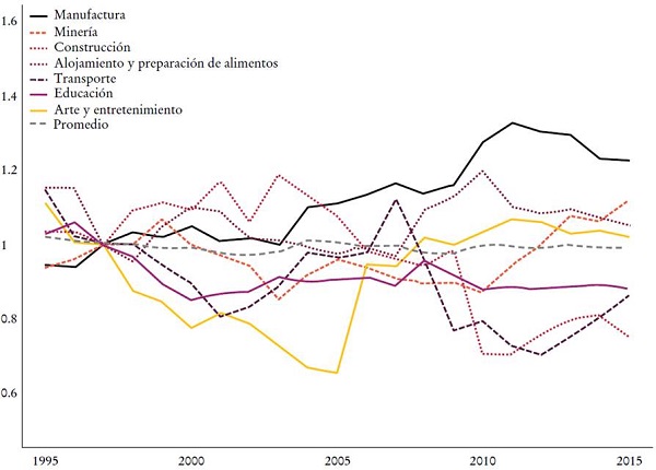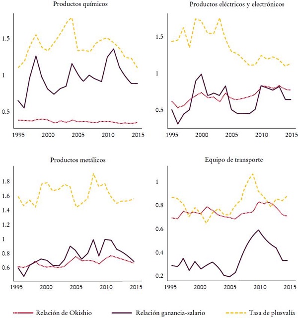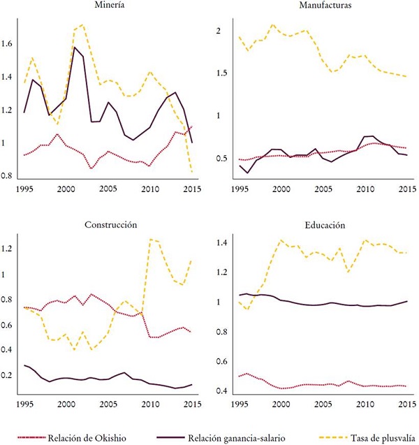 En segundo lugar, la tasa de plusvalía en la industria manufacturera fue excepcionalmente más alta que en las otras industrias reportadas en la Gráfica 3. Esto tiene que ver con el alto nivel de la relación ganancia-salario en esa industria.